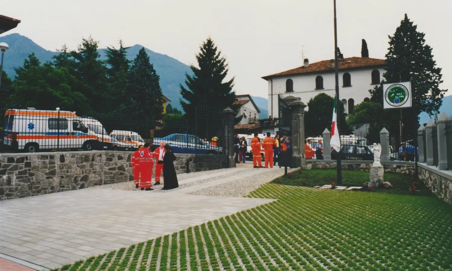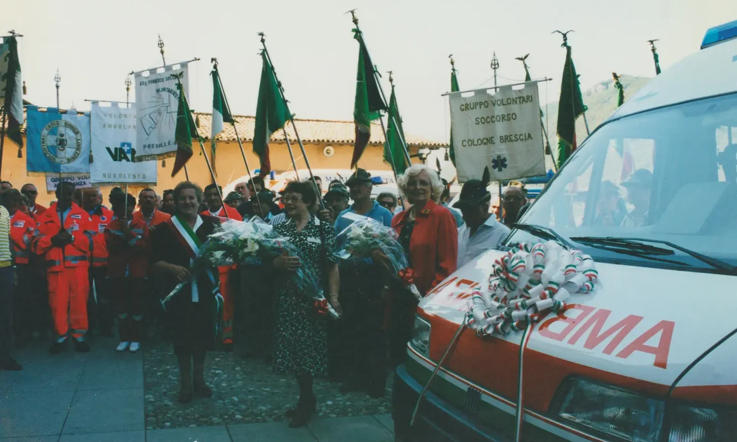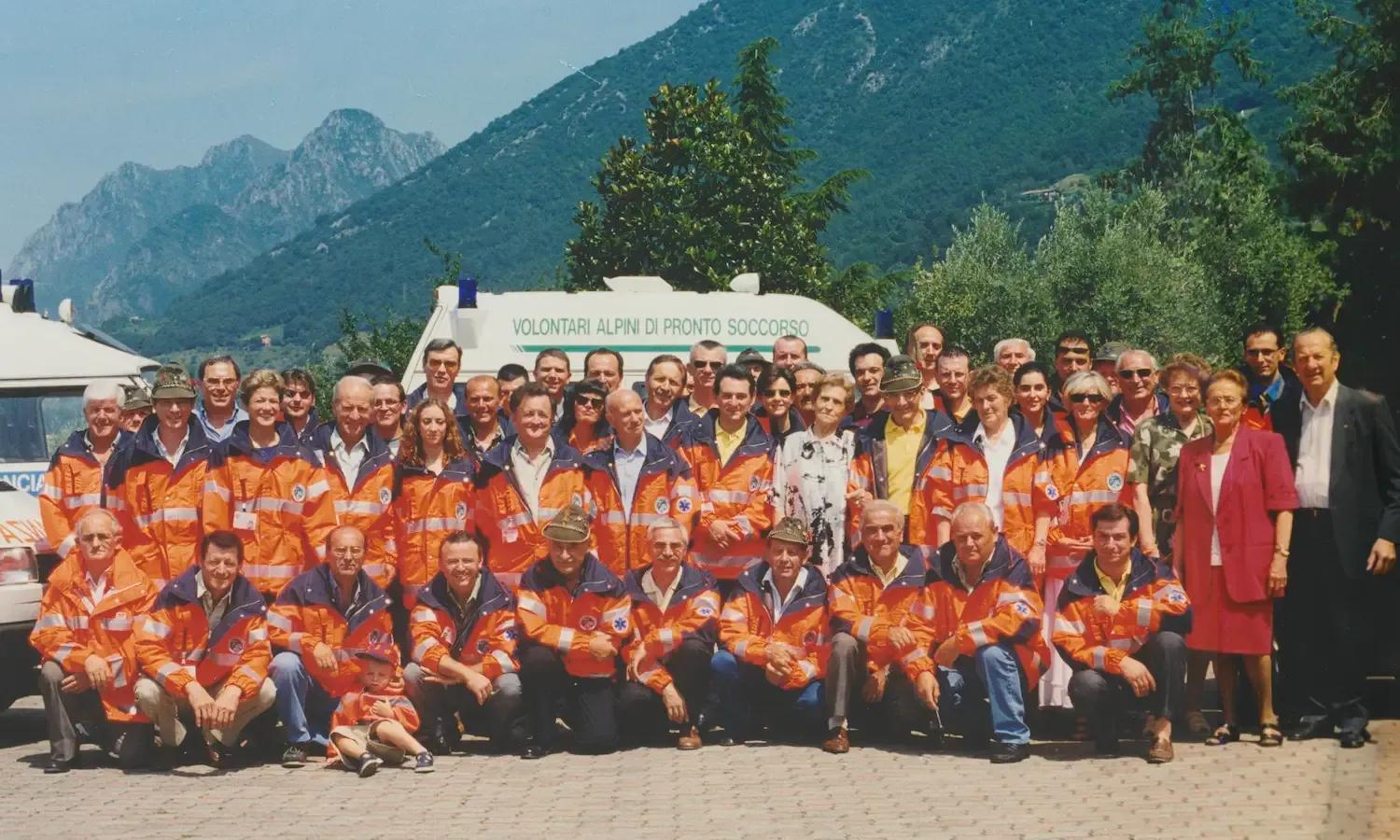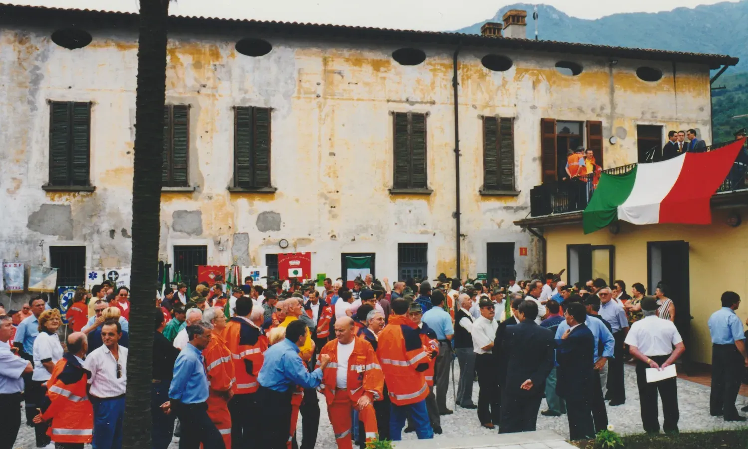 Foto d'archivio di raduno associativo con volontari soccorritori in divise operative blu navy, alcuni con cappelli da Alpini, e rappresentanti femminili in abiti da cerimonia con mazzi floreali, vessillo verde associativo visibile, scalinata monumentale e paesaggio prealpino come scenario naturale.