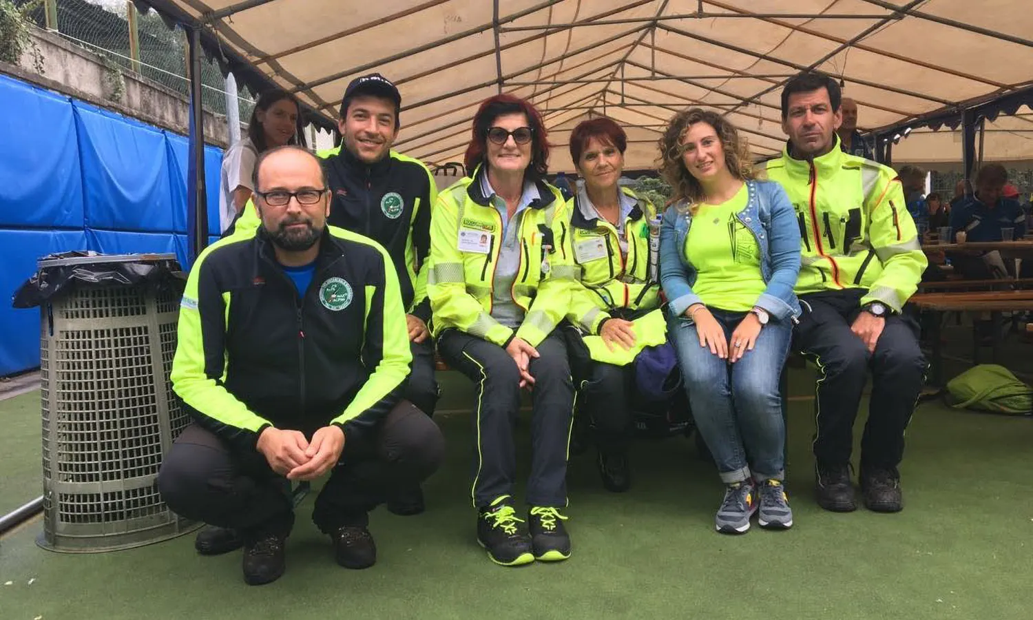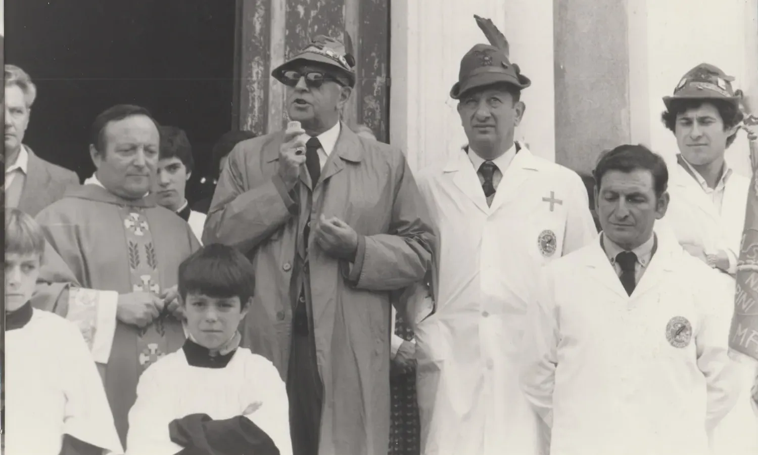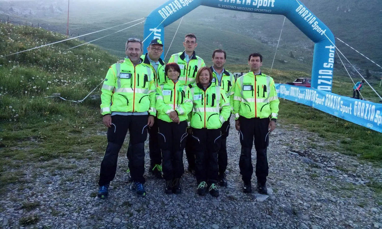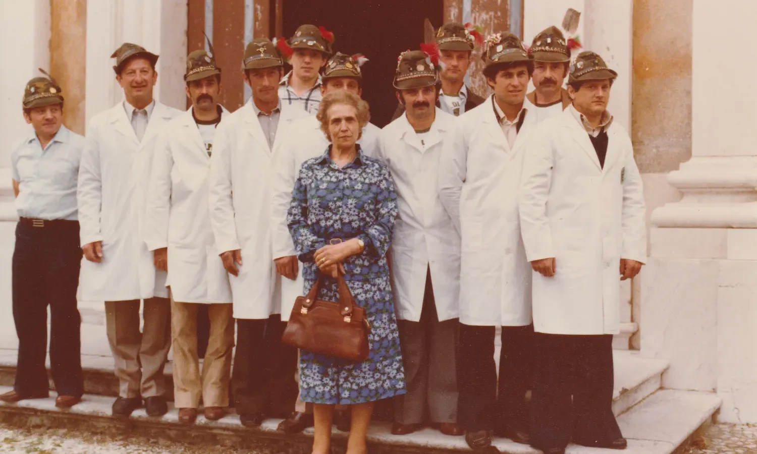 Foto d'archivio di raduno associativo con volontari soccorritori in divise operative blu navy, alcuni con cappelli da Alpini, e rappresentanti femminili in abiti da cerimonia con mazzi floreali, vessillo verde associativo visibile, scalinata monumentale e paesaggio prealpino come scenario naturale.