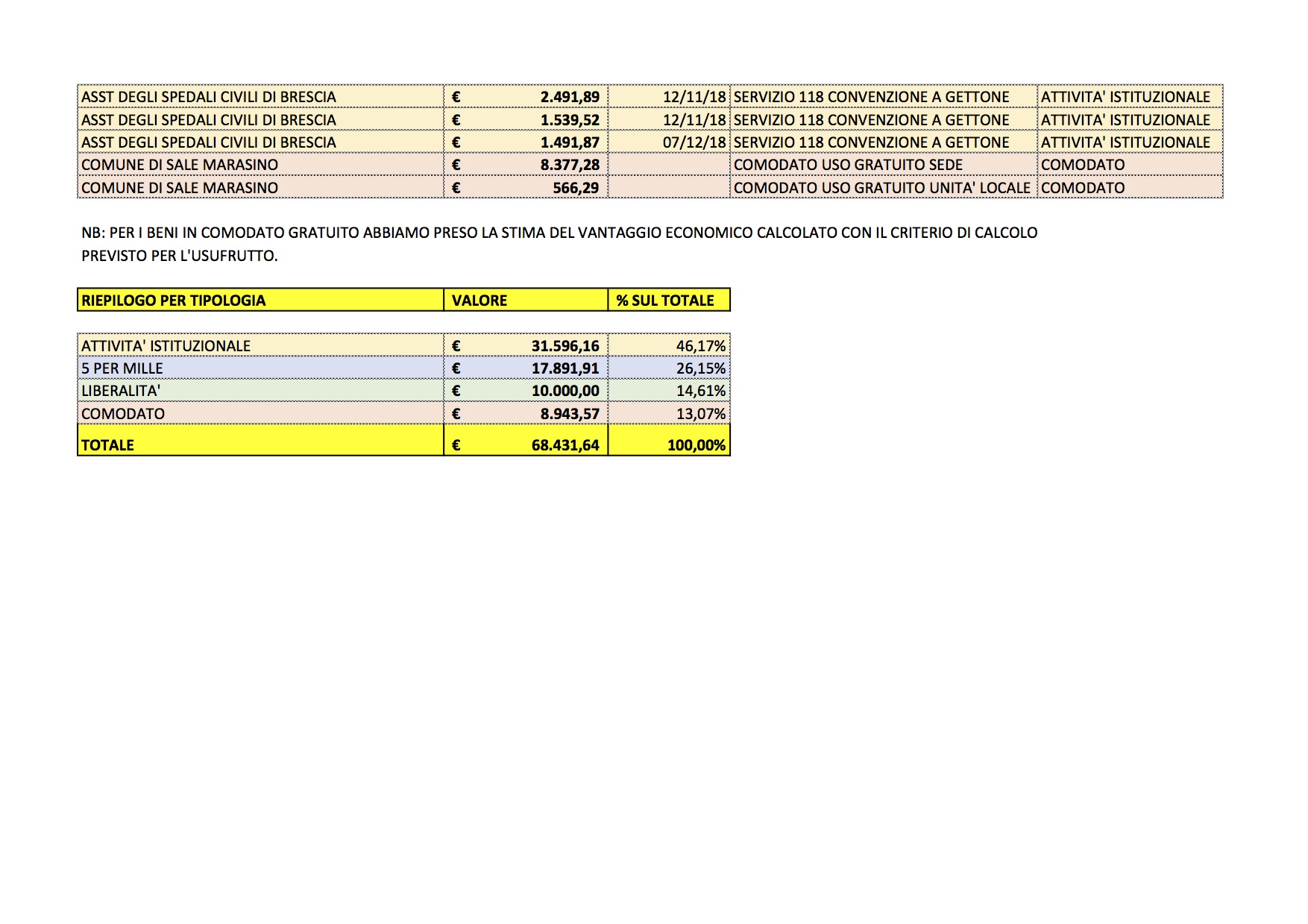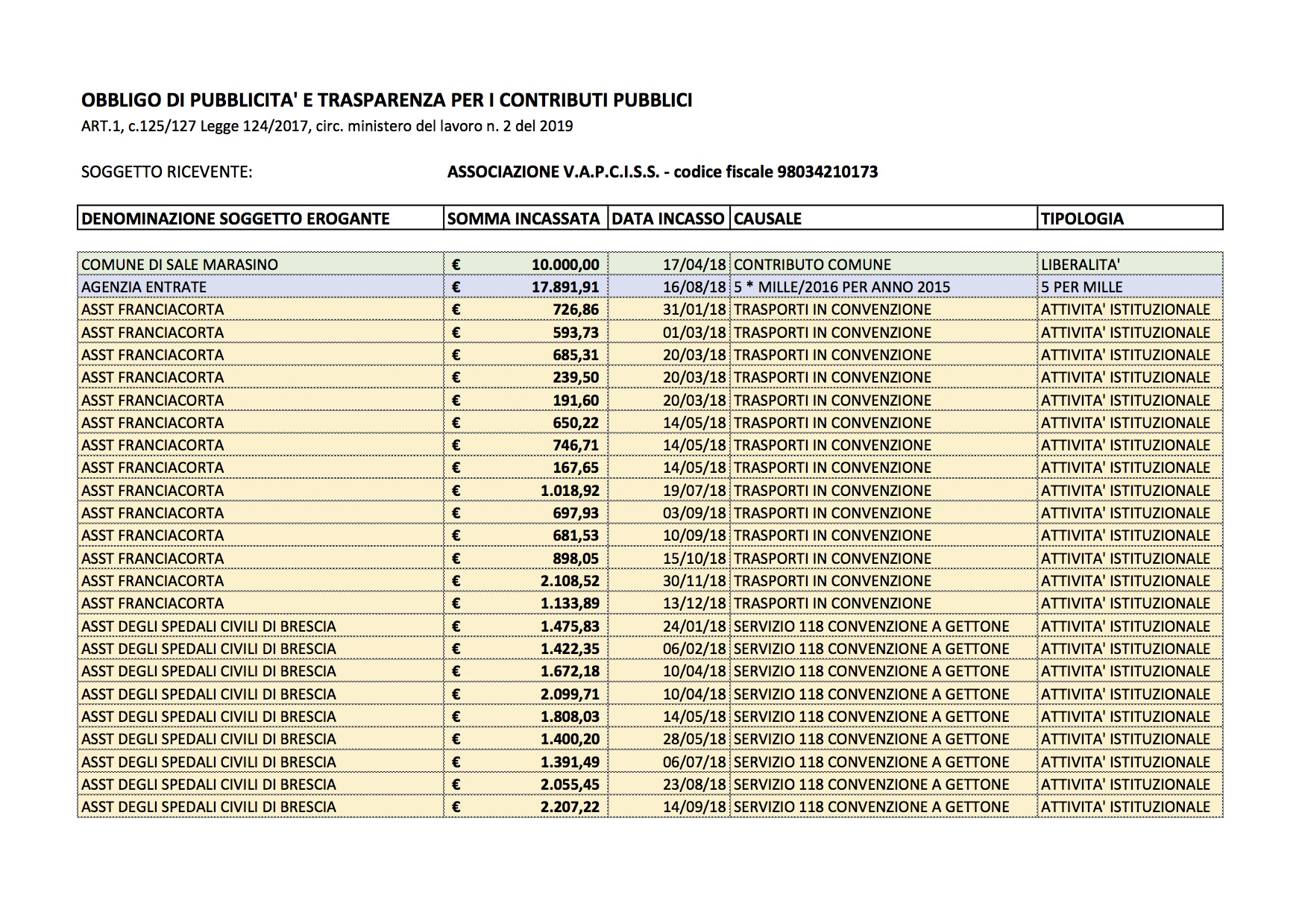 Tabella contributi, sovvenzioni, altre liberalità e somme ricevute dall’Associazione “VOLONTARI ALPINI PER LA PROTEZIONE CIVILE E L’INTERVENTO SOCIO SANITARIO – V.A.P.C.I.S.S.” nel corso dell’anno 2018
