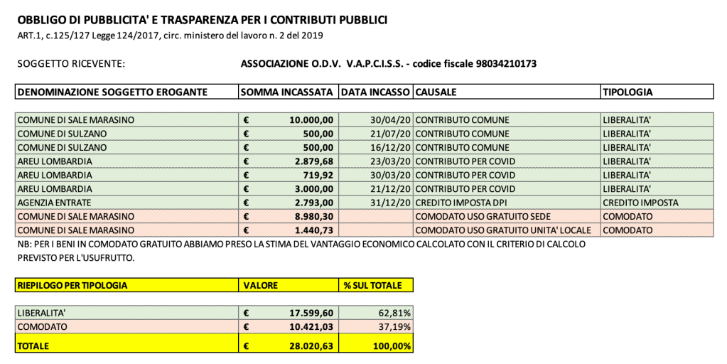 Tabella contributi, sovvenzioni, altre liberalità e somme ricevute dall’Associazione “VOLONTARI ALPINI PER LA PROTEZIONE CIVILE E L’INTERVENTO SOCIO SANITARIO – V.A.P.C.I.S.S.” nel corso dell’anno 2020
