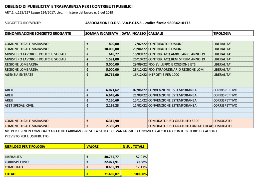 Tabella contributi, sovvenzioni, altre liberalità e somme ricevute dall’Associazione “VOLONTARI ALPINI PER LA PROTEZIONE CIVILE E L’INTERVENTO SOCIO SANITARIO – V.A.P.C.I.S.S.” nel corso dell’anno 2022